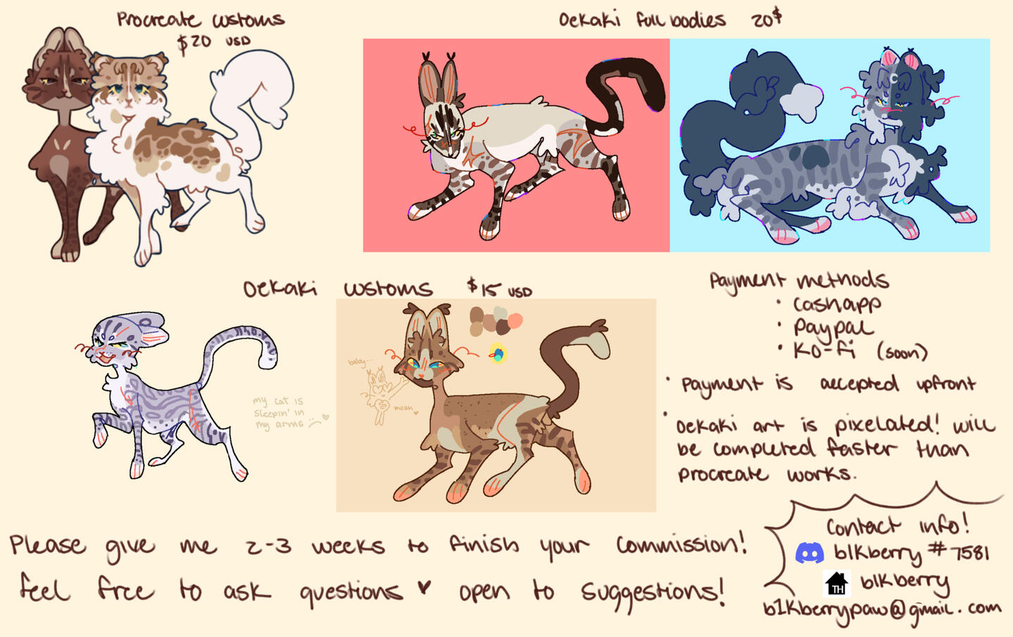 20 USD ✧ procreate custom these are custom warrior cat designs made one procreate!20 USD✧ oekaki fullbody fullbody of ur cat OC on oekaki.20 USD✧ oekaki custom these are custom cat designs oekaki. oekaki is a art program on the website chicken smoothie.oekaki commissions are finished faster than procreate drawings!